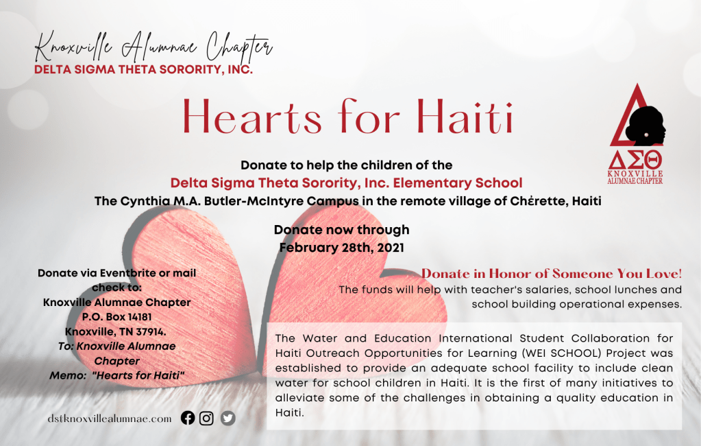 It’s the season of LOVE! Knoxville Alumnae’s International Awareness and Involvement Committee invites you to support its Hearts for Haiti campaign! Donate to help the children of the Delta Sigma Theta Sorority, Inc. Elementary School’s The Cynthia M.A. Butler-McIntyre Campus in the remote village of Chἐrette, Haiti. The funds will help with teacher’s salaries, school lunches, and school building operational expenses. Donate now through February 28th, 2021.