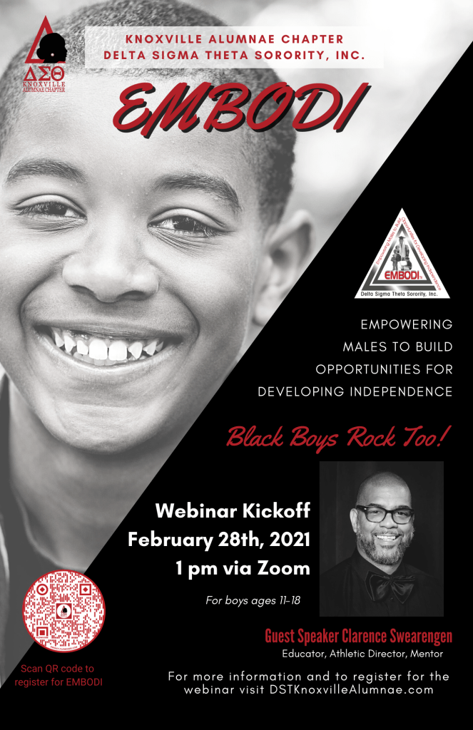 KICKOFF: The Knoxville Alumnae Chapter of Delta Sigma Theta Sorority, Inc is inviting male youth, ages 11-18, to join our 2021 EMBODI program. The virtual kickoff is Sunday, February 28th, 2021, at 1 pm via Zoom. Our special guest speaker is Clarence Swearengen, educator, athletic director, and mentor. Register for the webinar kickoff here.