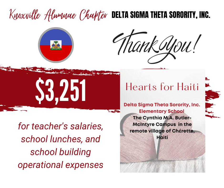 Hearts for Haiti: $3,251 in donations for the Delta Sigma Theta Sorority, Inc. Elementary School’s The Cynthia M.A. Butler-McIntyre Campus in the remote village of Chἐrette, Haiti.
