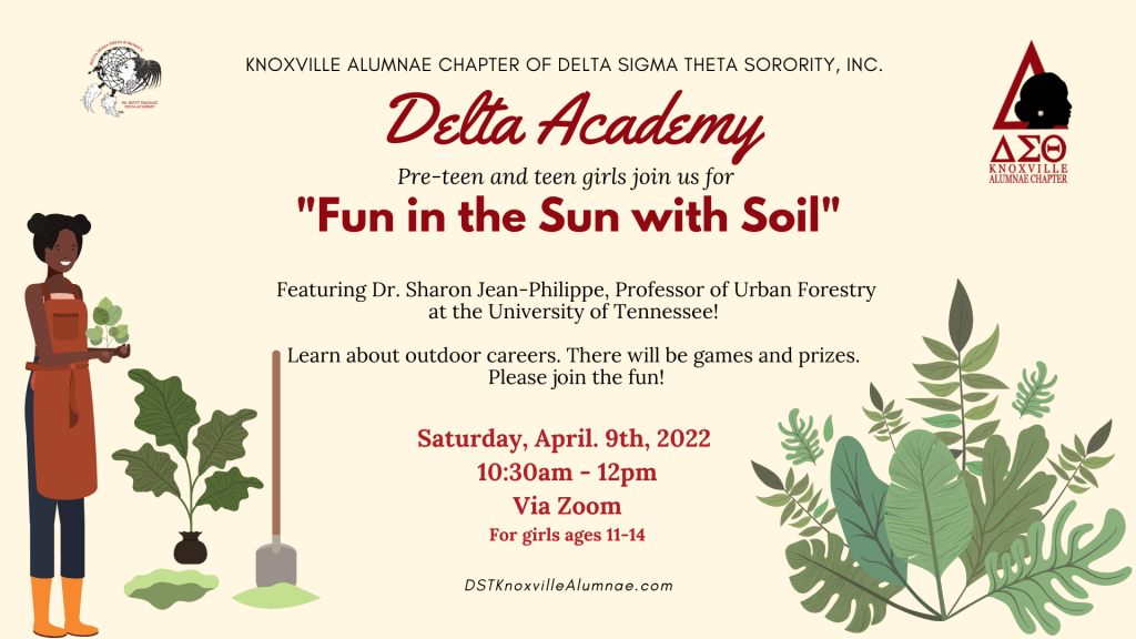 YOU’RE INVITED: The Knoxville Alumnae Chapter of Delta Sigma Theta Sorority, Inc. invites you to join the Dr. Betty Shabazz Delta Academy for “Fun in the Sun with Soil” featuring Dr. Sharon Jean-Philippe, Professor of Urban Forestry at the University of Tennessee.We’ll also learn about outdoor careers. We want to instill in our young girls that they can do anything. They must continue to push, dream and strive for their goals. Plus, there will be games and prizes. Please join the fun!