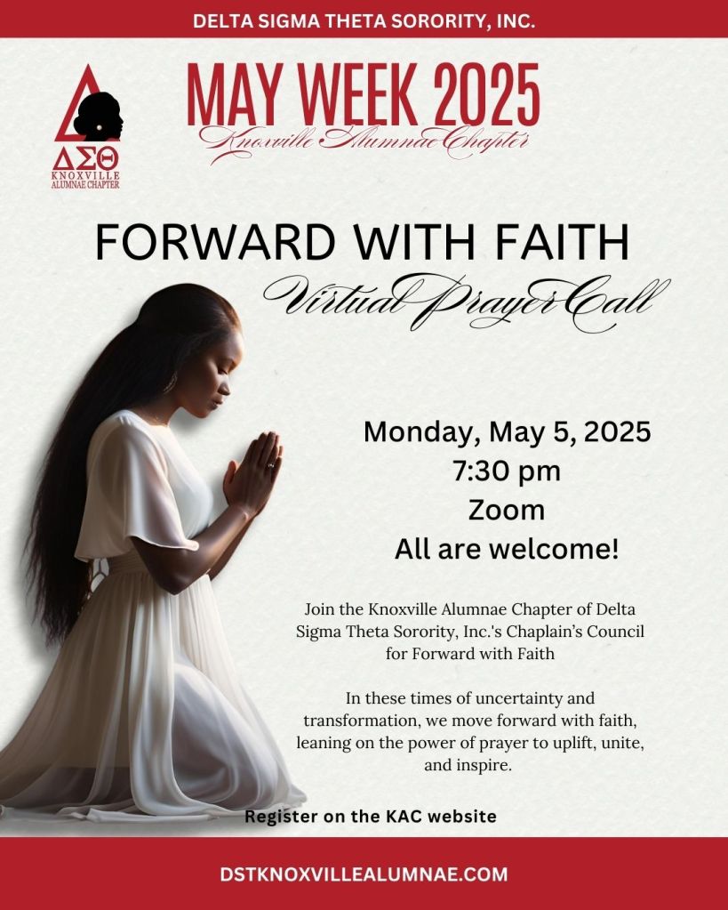 Join the Knoxville Alumnae Chapter of Delta Sigma Theta Sorority, Inc.’s Chaplain’s Council for Forward with Faith, a virtual prayer call open to the public. Bring your prayers, your presence, and your heart. Let us walk boldly in faith—together.