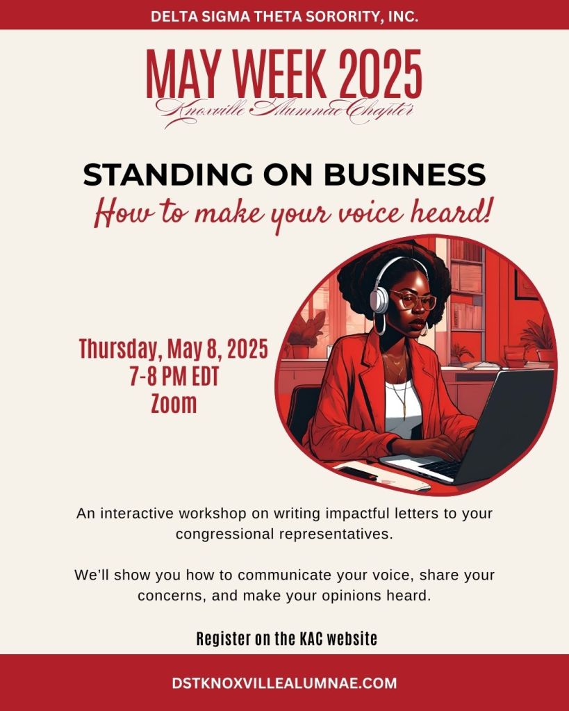 Join the Knoxville Alumnae Chapter for “Standing on Business: How to Make Your Voice Heard!” an empowering virtual workshop designed to teach you how to craft clear, impactful letters to your congressional representatives.