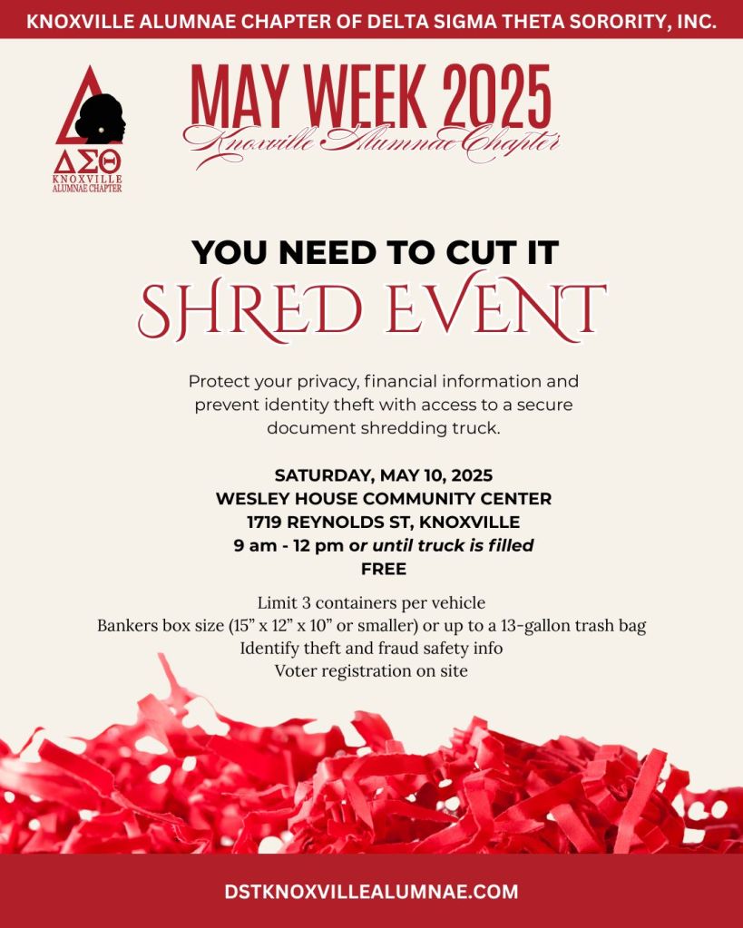 Join the Knoxville Alumnae Chapter of Delta Sigma Theta Sorority, Inc. for You Need to Cut It—a community shred event designed to help you securely dispose of personal documents and reduce the risk of identity theft.