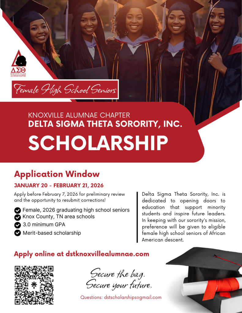 The Knoxville Alumnae Chapter of Delta Sigma Theta Sorority, Inc. is excited to announce that the application window for our annual scholarship is open until February 21, 2026.